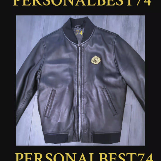 100% Luxury Leather Calf skin Bomber jacket with PERSONALBEST74 Gold Crest.